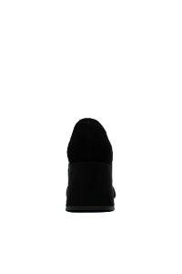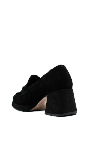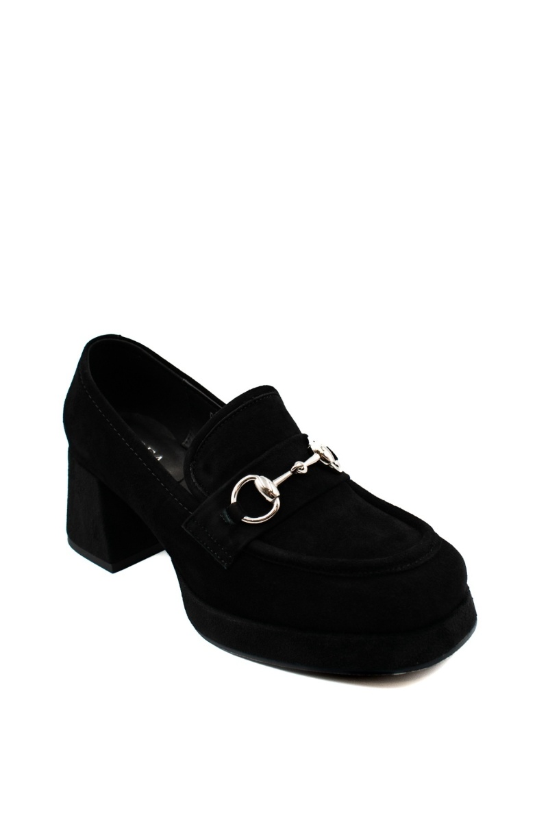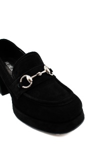 Елегантни дамски обувки тип лоуфър на ток – черен велур с метален акцент