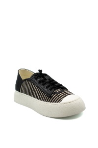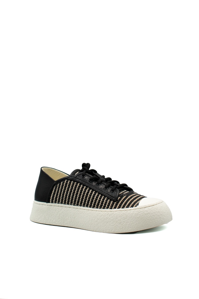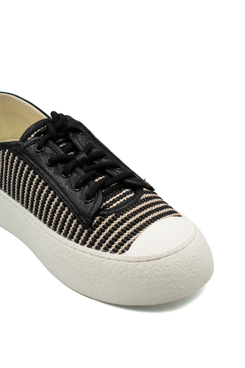 | Дизайн | Контрастни райета в черно и бежово, съчетани с изчистен черен кожен детайл на петата |